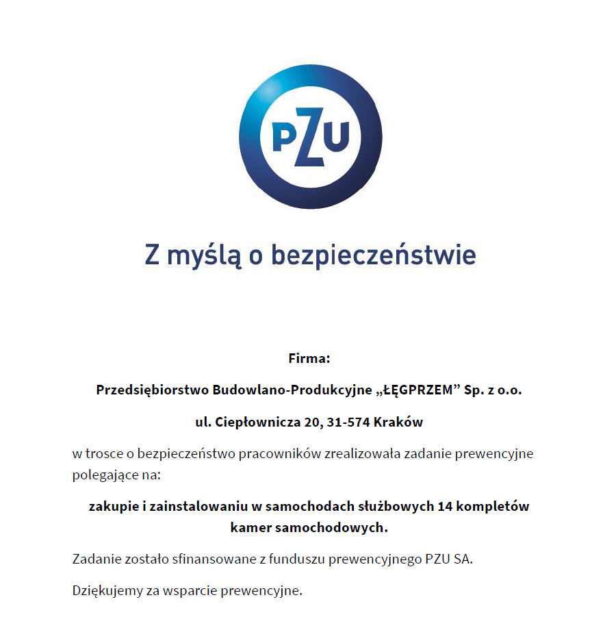 Z przyjemnością informujemy, że nasza firma, w ramach zadania prewencyjnego, zakupiła 14 kompletów kamer samochodowych ze środków funduszu prewencyjnego PZU.  W ramach  wkładu własnego zainstalowano w/w kamery w 14 samochodach służbowych oraz dodatkowo dokupiono i zainstalowano kolejnych 6 kompletów.